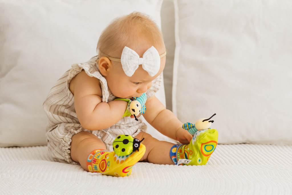 Babád minden mozdulatát vidám hangok fogják kísérni ezzel a bájos csörgő zokni és csuklócsörgő szettel. Minden rovar halk hangot ad ki mozgatáskor, míg a pillangó szárnyai lágyan rezegnek, hogy örömet szerezzenek a kicsinek. Az anyagok változatos textúrája stimulálja az érzékeket és támogatja gyermeked kognitív fejlődését. A szett egy pár zoknit és egy tépőzáras csuklócsörgőt tartalmaz, puha és biztonságos anyagokból, amelyek alkalmasak az érzékeny bababőrre. Újszülött kortól használható.