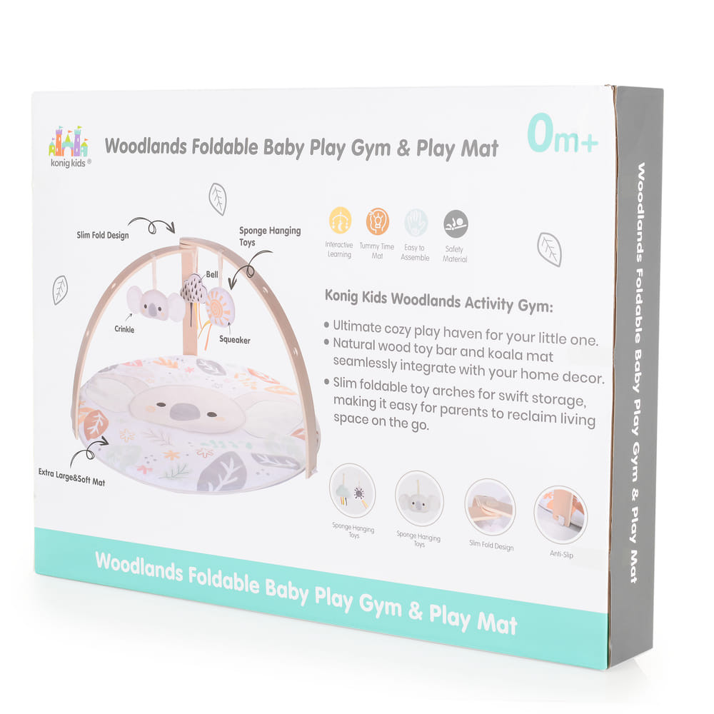 A termék 0 hónaposnál idősebb gyermekek számára készült. Az activity játszószőnyeg 2 játékpozícióval rendelkezik - háton és hason fekve. A készletben több játék is található - KOALÁVAL, nyikorgó hangokkal és csörgővel, felhő csengővel és 3 puha játékkal. A játékok a játékrudakra rögzíthetők. A természetes fából készült játékrudak és a koalás alátét úgy vannak kialakítva, hogy gyönyörűen kiegészítsék az otthoni színvilágot, és nyugodt környezetet teremtsenek a baba számára. Ez a termék segíti a gyermekek fejlődését, a kéz- és láb finom motorikát, a különböző formák és színek felismerését. A játék tornáztató szőnyeg nem mérgező anyagokból készült, biztonságos a gyermekek egészsége szempontjából. Anyaga: bükkfa és poliészter.
