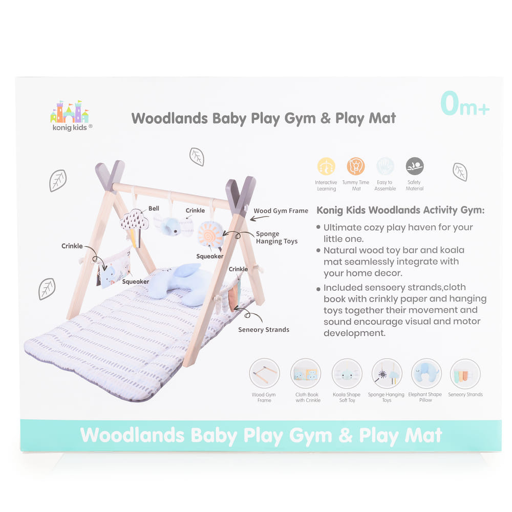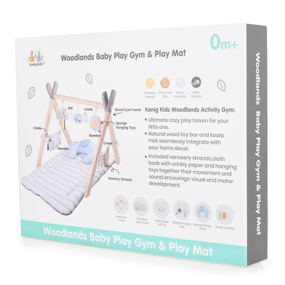 A termék 0 hónaposnál idősebb gyermekek számára készült. Az activity játszószőnyeg 3 játékpozícióval rendelkezik - háton, hason fekve és ülő pozícióban.A készletben párna, gyűrődő oldalakkal ellátott szövetkönyv, több játék is található - elefánt fülekkel, nyikorgó hangokkal és csörgővel, felhő csengővel és 3 puha játékkal. A játékok a játékrudakra rögzíthetők. A természetes fából készült játékrudak és az elefántos alátét úgy vannak kialakítva, hogy gyönyörűen kiegészítsék az otthoni színvilágot, és nyugodt környezetet teremtsenek a baba számára. Ez a termék segíti a gyermekek fejlődését, a kéz- és láb finom motorikát, a különböző formák és színek felismerését. A játék tornáztató szőnyeg nem mérgező anyagokból készült, biztonságos a gyermekek egészsége szempontjából. Anyaga: fenyőfa és poliészter.