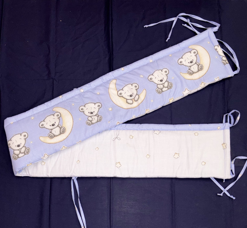 Fejvédő / Rácsvédő (23x190 cm): Ez a hosszú, puha elem a kiságy rácsaira rögzíthető. Megvédi a baba fejét és végtagjait az ütődésektől, illetve megakadályozza, hogy a keze vagy lába beszoruljon a rácsok közé. A 190 cm-es hosszúság általában a kiságy felét vagy kétharmadát öleli körbe.